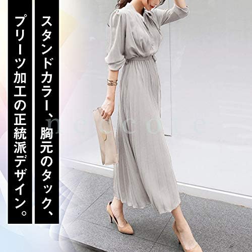 シンプルで大人っぽいデザインのきれいめロングワンピース。スタンドカラー、胸元のタック、プリーツ加工の正統派デザイン。普段のお出かけにはもちろん、通勤にもご着用いただけるワンピースです。