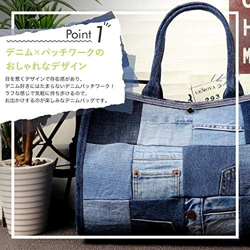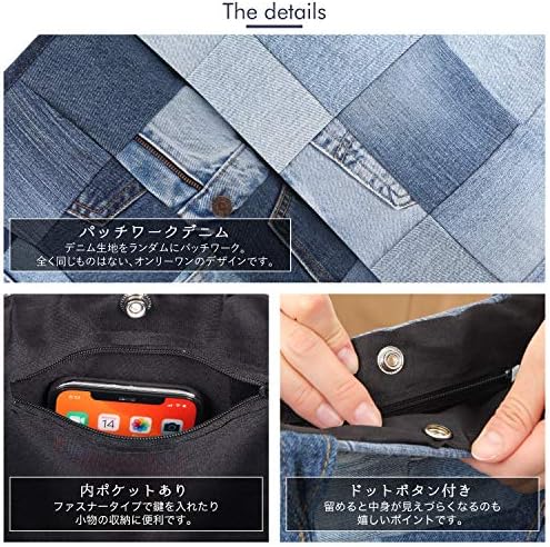 【細部のこだわり】①パッチワークデニム:デニム生地をランダムにパッチワーク。全く同じものはない、オンリーワンのデザインです。②内ポケットあり:ファスナータイプで鍵を入れたり小物の収納に便利です。③ドットボタン付き:留めると中身が見えづらくなるのも嬉しいポイントです。