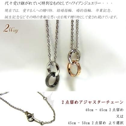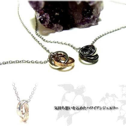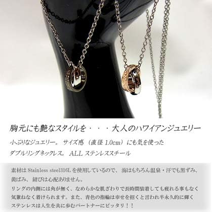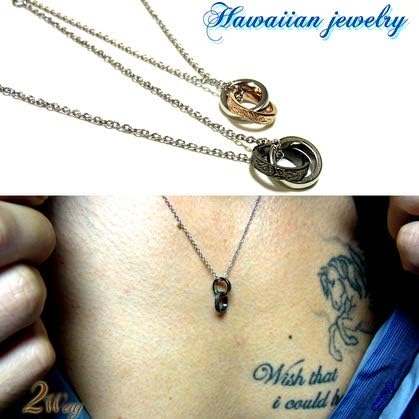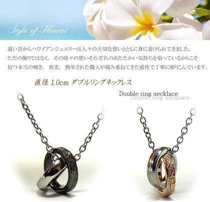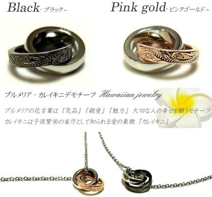 スクロールとプルメリアの掘り込みが美しくオシャレな2連リングネックレス。綺麗なカラーリングで人気のピンクゴールドとブラックカラーのペア。