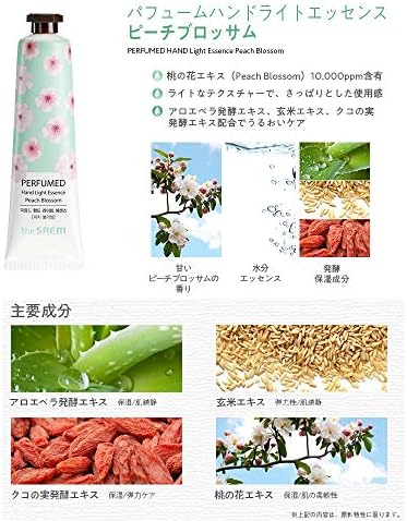 ■ピーチブロッサム(ハンド ライトエッセンス):桃の花エキス(Peach Blossom) 10,000ppm含有、ライトなテクスチャーでさっぱりとした使用感、アロエベラ発酵エキス・玄米エキス・クコの実発酵エキス配合でうるおいケア ■甘いピーチブロッサムの香、水分エッセンス、発酵保湿成分 ■主要成分: アロエベラ発酵エキス(保湿/肌鎮静)、玄米エキス(弾力性/肌鎮静)、クコの実発酵エキス(保湿/弾力ケア)、桃の花エキス(保湿/肌の柔軟性) ※主要成分の内容は、原料特性に限ります。