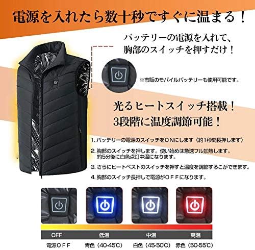 **<3段調温+急速加熱> 強(赤)・中(白)・弱(青)の3段温度設定し、色により温度段階も一目で分かりやすくてボタンを押すと簡単に調温できます。電源を入れた後、約3〜5秒間ゆっくり加熱し始めます。電熱 ベストの美しさのために、USB電源線は内ポケッドに置きますよ。