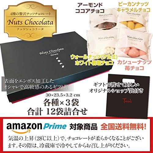 【内容量】アーモンドココアチョコ3袋、ピーカンナッツキャラメルチョコ3袋、ウォールナッツ(くるみ)ホワイト岩塩チョコ3袋、カシューナッツいちごチョコ3袋の各種18g×3袋=合計12袋詰合せセット。