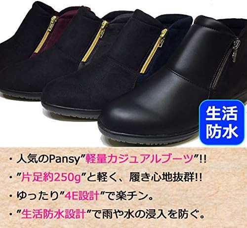 Pansy パンジー ブーツ ショートブーツ レディース 幅広 4E ブーツ 女性 バイカラー 防水 かわいい 冬ブーツ 黒 ブラック グレー ネイビー ボルドー!ファスナーの色は、ダークグレー、ネイビー、ボルドーはゴールドファスナー、スムースブラックは、ブラックファスナーとなります。防水設定 静水4cmに4時間浸した防水性を基準としております。完全防水ではございませんので、長時間着用すると水が浸入する場合がございます。撥水加工を施したスエード調素材を使用(スムースブラック除く) 甲外側にファスナー、内側にゴム付きで楽チン ゆったり4Eの木型で設計 抗菌防臭加工付中敷を使用 中敷下面に冷気を遮断する断熱性シート「ミラマット」を使用。