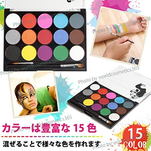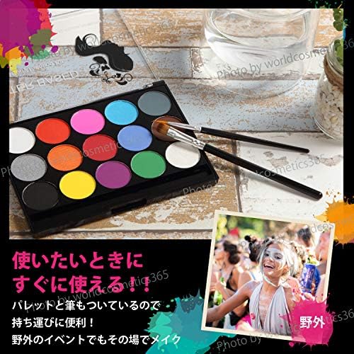 フェイスペイント 15色 専用筆 6本セット 安全 ボディペイント アートメイク アイシャドウ アイライン チーク メイクアップ 化粧 コスプレ 小道具 メイク コスメ 仮装 安全 絵具 ハロウィン Halloween クリスマス