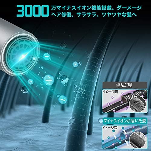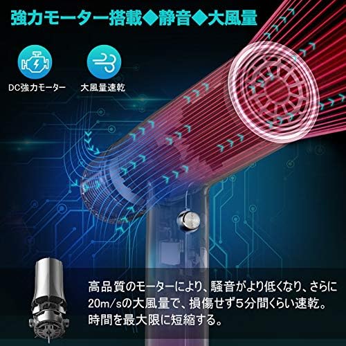 【20m/s大風量&低騒音】ヘアドライヤーは普通のドライヤーよりコンパクトで、より高速で高品質モーター(長持ちできます。)を搭載されており、髪の根元まで届く高速ダイナミック風を実現。非速乾タイプに比べて、速乾タイプでは髪の表面温度が低くても乾燥時間が短くてすむため、過熱による髪のダメージを抑えることができます。 20m/s (ノズル装着なしの時)の風速ですばやく髪を乾かします、朝も夕方も髪を乾かす時間を節約します。さらに、作動中に低騒音でご近所にご迷惑をかけません。