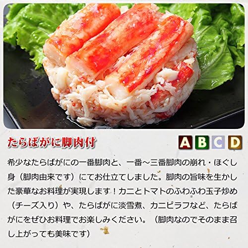 原材料名:たらばがに、砂糖、食塩、調味料(アミノ酸等)、リン酸塩(Na)、増粘多糖類、酸化防止剤(亜硫酸塩)