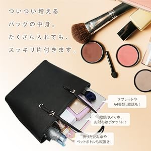 財布、手帳、スマートフォン、書類、折り畳み傘、雑誌、化粧品など必要な物がたくさん収納可能。