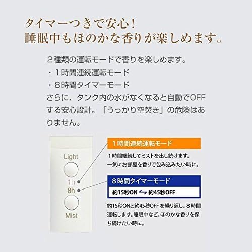 【超音波による安心設計】水切れの際の自動電源オフ、おやすみタイマー、2段階の明るさ調整機能付きルームライトなど、機能性も充実。火を使わないため熱による香りの変質がなく、取り扱いも安心です。【簡単お手入れ】お手入れは水を捨てて拭き取るだけ。「お手入れが面倒…。」という方も、毎日気軽にお使いいただけます。