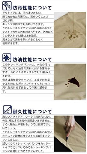 防油性能:このトレッキングパンツは水性の汚れだけではなく、 油性の汚れに対する落ちやすさ、汚れにくさのテストでも2.5級以上を取得。 例えば農作業やキャンプ、工場での作業や工作時にも、 ガソリンやオイルといった汚れを気にせず安心して作業に望めます。 ●速乾性能 雨や泥や油に強いだけではなく、速乾性にも優れています。 テフロン(TM)ファブリックプロテクター加工を施したラドウェザーのトレッキングパンツは、 水に濡れてもすぐに乾きます。 試しにバケツの水に3時間浸しても、30分後には元通りに乾いていました。