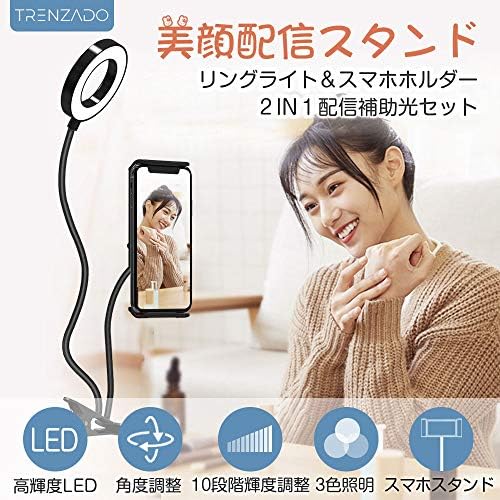 スマホスタンドと自撮りLEDリングライトの2in1タイプ クリップ式 高輝度 撮影用ライト 3モード調色 10段階調光
