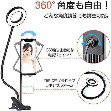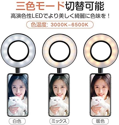 リングライト クリップ式 3色モード スマホスタント付き 10段階調光 自撮り/照明兼用 高輝度LED 補光 360度回転可能 撮影照明用ライト YouTube/Tik Tok/Web会/ビデオ通話/美容化粧/YouTube生放送/自撮り写真/カメラ撮影に適用
