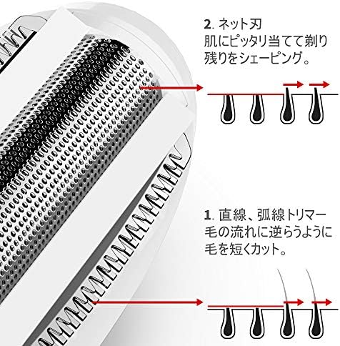 ネット刃、トリマー刃できれいな仕上がり。トリマー刃は最新のR型鈍角保護システムを採用し、デュアル刃は往復してデリケートな肌を傷めずにムダ毛を手軽にシェービング。剃り味長持ちのステンレス刃を採用している内側の動く刃(内刃)が直接肌にあたらないのでムダ毛をやさしくシェービングする同時に、安全性を保障します。