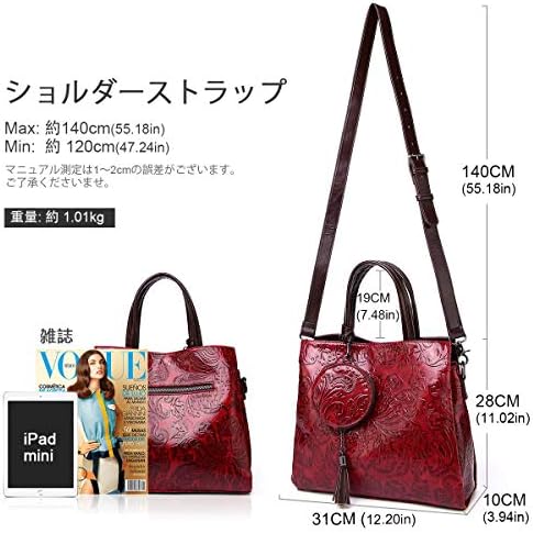 サイズ:約ヨコ31cmxタテ28cmxマチ10cm 持ち手の高さ:約19cm。ハンドル部分は十分な長さがあり肩かけで使う事もできますので、重い荷物を入れた時も安心です。重量:約1.01kg ★ショルダーストラップ:約140cm ★ショルダーベルトは調節できるので、ハンドバッグだけではなく、お服のスタイルによってショルダーバッグとしても利用できます。