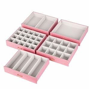 パット全部見える好きな場所で使える たくさんのジュエリーを一目でパット見渡せるから選ぶのもスムーズ。 引出しごと取り出してコーディネートしやすい場所に移動もできちゃう! ~最上段: オープンスペース リング差し付き