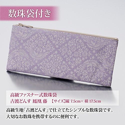 房は京都の伝統工芸である「京房ひも」の職人が製作した正絹頭付房を使用しております。小さいバッグにも収まりやすいコンパクトサイズの高級ファスナー式数珠袋をお付けします。