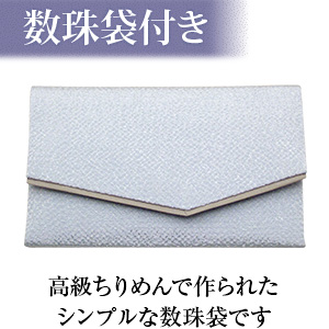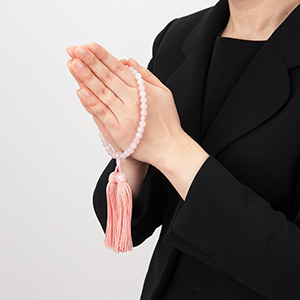 数珠はお葬式や法事、お墓参りの時に手にかける最も身近な仏具です。常にこれを持って仏さまに手を合わせれば、煩悩が消滅し功徳を得られるといわれています。数珠は合掌する手にかけ、仏さまと心を通い合わせる大切な仏具で、仏事には忘れてはならない必需品です。