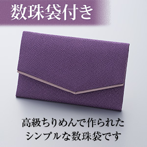 高級ちりめんで作られたシンプルな数珠袋をお付け致します。数珠袋とセットですので、個別に数珠袋をお買い求めいただく必要がなく、そのままお葬式や法事にお持ちいただけます。
