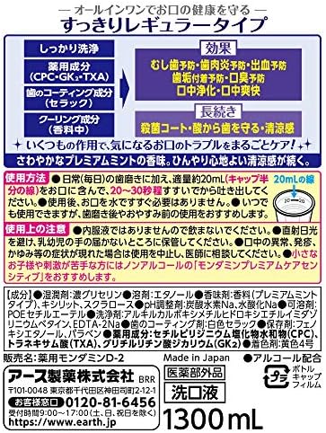 すすぐだけで、むし歯予防、歯肉炎予防、出血予防、歯垢付着予防、口臭予防、口中浄化、口中爽快の効果と、殺菌コート・酸から歯を守る・清涼感が長続きする、オールインワン。気になるお口のトラブルをまるごと予防します。お得な大容量1300mLだから家族みんなで使えます。