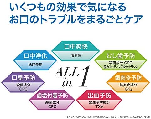 【7つの効果】虫歯予防 / 歯肉炎予防 / 出血予防 / 歯垢付着予防 / 口臭予防 / 口中浄化 / 口中爽快