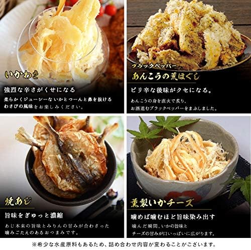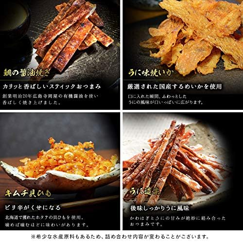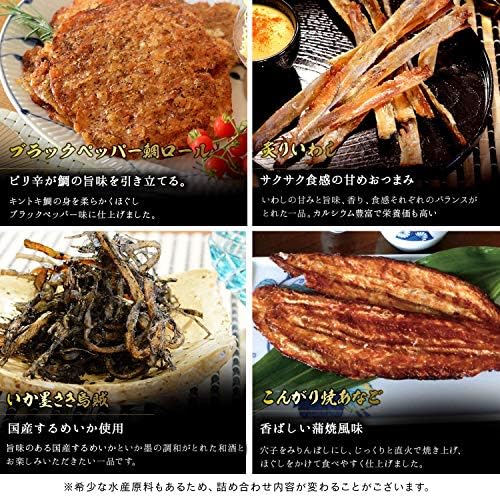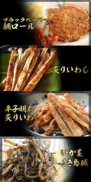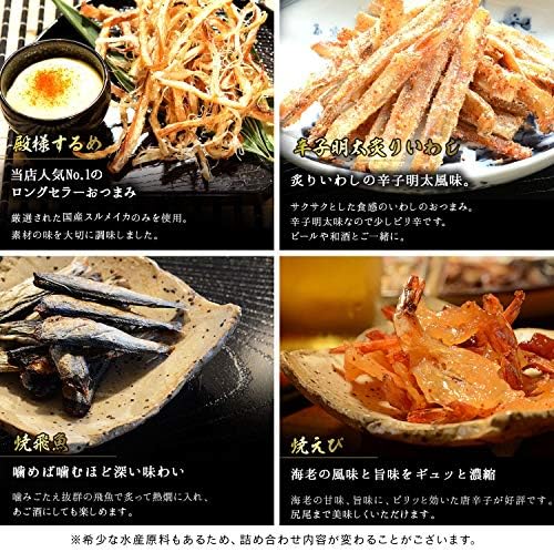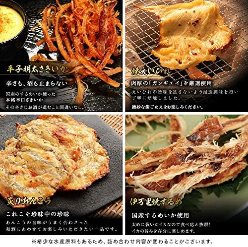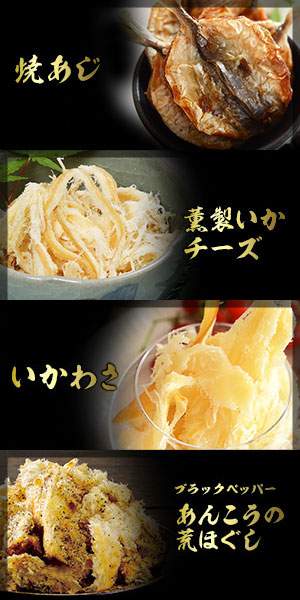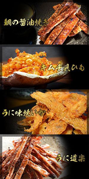 1)いか墨さきいか 2)辛子明太さきいか 3)焼えいひれ 4) 伊万里焼するめ 5)炙りあんこう 6)こんがり焼あなご 7)殿様するめ 8) 辛子明太炙りいわし 9)食べる焼飛魚 10)焼えび 11)鯛の醤油焼き 12)キムチ貝ひも 13)うに道楽 14)うに味焼いか 15)炙りいわし 16)ブラックペッパー鯛ロール 17)いかわさ 18)ブラックペッパーあんこう荒ほぐし 19)薫製いかチーズ 20)焼あじ