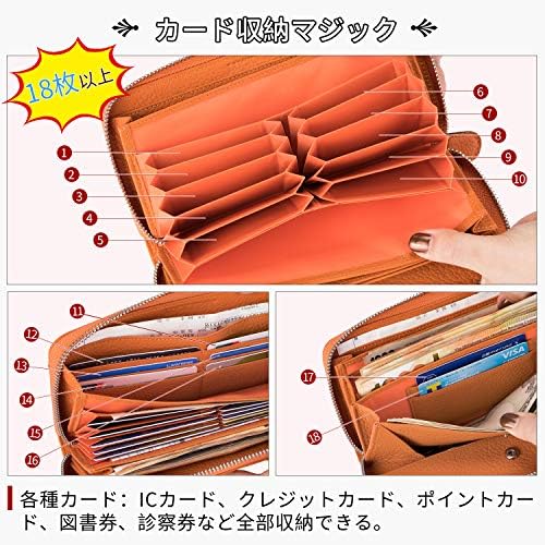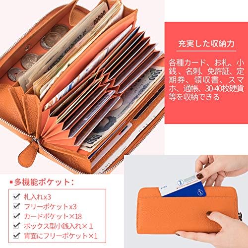 【長財布大容量】:カードポケット×18、フリーポケット x 3、札入れ x 3、 ボックス型小銭入れ×1、背面にフリーポケット×1。各種カード、お札、小銭 、領収書、スマホ、を収納できる。
