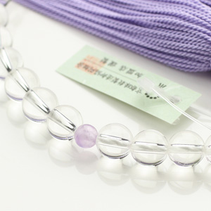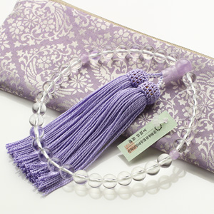 すべての宗派のお客様にお使い頂ける女性用のお数珠でございます。素材は、高級感ある約8ミリサイズの本水晶でございます。アクセントには、優しい色合いの藤雲石(とううんせき)を使用させて頂きました。品質にはこだわり、お作りいたしました。もちろん房は、正絹製でございます。京都の職人が丹精込めて製作したという証拠である 「京念珠保証タグ付」の品質でございます。高級数珠袋とセットですので、個別に数珠袋をお買い求め頂く必要がなく、そのまま葬儀や法事にお持ち頂けます。
