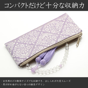 法事にお使い頂く小ぶりなバックにも収納できる、コンパクトな数珠袋です。大切なお数珠を保護し、ファスナー式ですので、葬儀などの場でも、スムーズに出し入れできる、便利な高級数珠袋です。