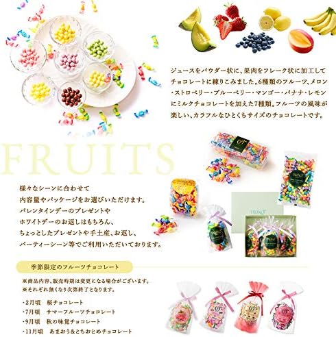 ▼ ギフトに最適:カラフルなフルーツチョコは、見た目も可愛くバレンタインデーやホワイトデーの贈り物やお返しにぴったりです。もちろん自分やお子様へのおやつとして、結婚祝・引っ越し祝い・内祝いなどの贈り物として、ちょっとしたプレゼントにもぜひご活用ください。プレゼントとしてすぐ使える様に、箱の中に単品のリボン付きのチョコレートとプレゼント袋が各10袋がセットされています。プレゼント袋(小)は季節により図柄が変更になる場合がございます。予めご了承ください。