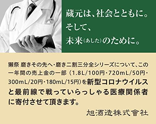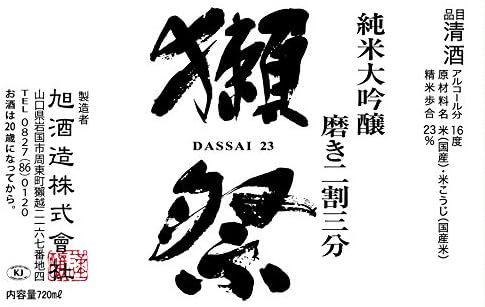 ギフトに最適な「感謝」と記載の木箱入り。23%(77%)という極限まで磨いた山田錦を使い、最高の純米大吟醸に挑戦しました。華やかな上立ち香と口に含んだときのきれいな蜂蜜のような甘み、飲み込んだ後口はきれいに切れていきながらも長く続く余韻。生活の、一つの道具として楽しんで頂ける酒を目指して、「獺祭」(だっさい)を醸しております。