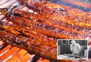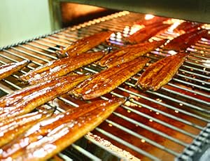 熟練の職人により手早くさばかれたウナギは、すぐさま蒲焼きの工程へ。まず、焼く前に蒸すことで、ふっくらとした食感を作ります。その後、白焼きにしてから専用のタレを付け、さらに焼くという工程をじっくり4回繰り返すことで、食欲をそそる香ばしさと深い味わいに仕上がります。