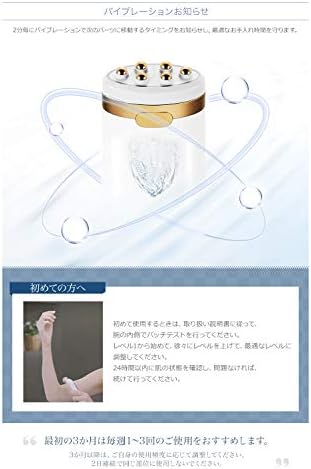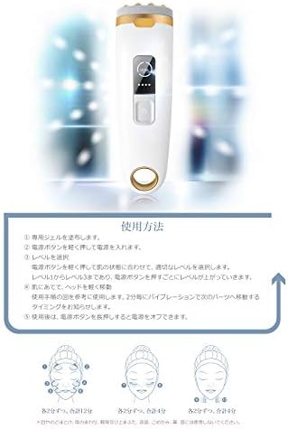 使用方法 1.専用ジェルを塗布 します。 2.電源ボタンを軽く押して電源を入れます。 3.レベルを選択:電源ボタンを軽く押して肌の状態に合わせて、適切なレベルを選択します。 レベル1 からレベル3 まであり、電源ボタンを押すごとにレベルが上がっていきます。 4.肌にあてて、ヘッドを軽く移動:使用手順の図を参考に使用します。2 分毎にバイブレーションで次のパーツへのケアのタイミングをお知らせします。 5.使用後は、電源ボタンを長押しすると電源をオフできます。
