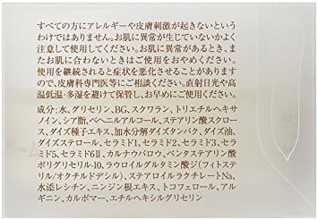 全成分:水、グリセリン、BG、スクワラン、トリエチルヘキサノイン、シア脂、ベへニルアルコール、ステアリン酸スクロース、ダイズ種子エキス、加水分解ダイズタンパク、ダイズ油、ダイズステロール、セラミド1、セラミド2、セラミド3、セラミド5、セラミド6II、カルナウバロウ、ペンタステアリン酸ポリグリセリル-10、ラウロイルグルタミン酸ジ(フィトステリル/オクチルドデシル)、ステアロイルラクチレートNa、水添レシチン、ニンジン根エキス、トコフェロール、アルギニン、カルボマー、エチルヘキシルグリセリン