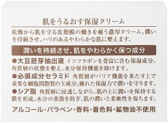 コクのある濃厚な質感で、肌の潤いを持続させる保湿クリーム。角質層の状態を整える大豆由来成分とバリア機能を補う5種類のセラミド、エモリエント成分シア脂を配合しました。水分の蒸散を防ぎ、ハリのあるやわらかな肌に整えます。アルコール(エタノール)・パラベン・香料・着色料・鉱物油不使用。