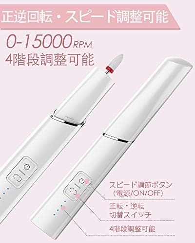 かい研削まで、必要に応じて回転スピードを4階段に調整可能です。必要に応じて最適なスピードでネイルケアしてください。 ご注意:使用している際は必ず一定方向に動かしてください。同じ箇所を削り続けると、皮膚や自爪を傷つける場合があるので、絶対にお止めください。