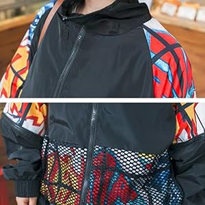 モード・個性派・サブカルなどにピッタリのスカジャン風ウインドブレーカー。 袖の上部分と前身頃の下部分が前衛的なアートプリントで切り替わったライトアウターです☆素材は軽くて薄手のシャカシャカ生地を使用しています。