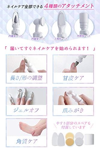 【1台4役!アタッチメントを変えて磨くだけで爪がピカピカに!】ネイルファイル、バッファー、シャイナー、ポリッシャーとアタッチメントを豊富に付属しており、爪の整形、表面慣らしから、磨きまで4つのアタッチメントを変えるだけでカンタンにネイルをケアできます。ジェルオフや甘皮処理までもできます。