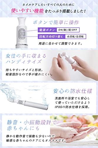 【安心安全の防水仕様】IPX6相当の防水仕様のため、ネイルを削る際に発生する削りカスを防止するために洗面所やお風呂などでも使用できます。(充電部、アタッチメント接続部に水が入らないように使用ください。)【全品検品済み、安心の一年保証】商品はすべて検品済みです。万が一初期不良 や使用中に不具合が発生した場合は購入から一年間の保証をお付けしておりますので、安心してお買い求めくださいませ。
