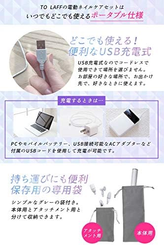 【携帯専用袋付属、USB充電式でいつでもどこでもネイルケア】 本体専用袋、アタッチメント専用袋それぞれに付属しているのは当商品だけ!専用袋付で持ち運びでき、USB充電式のため旅行先やオフィスなどいつでも充電して使えます。 一回のフル充電で約70回使用できるので、バッテリーを心配することなく使用できます。