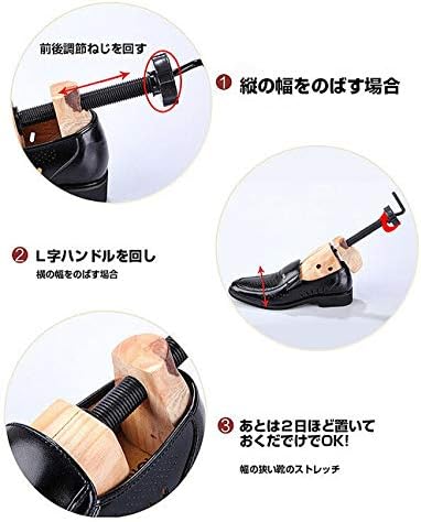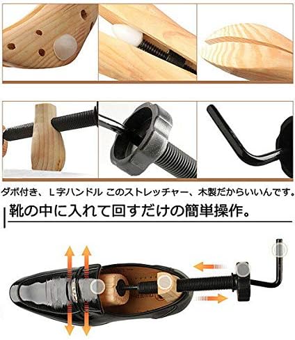 シューズストレッチャーを靴に入れて、最末端のL型の取っ手を右に回すと、シューズストレッチャーが左右を開くことになります。