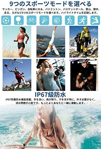 【多運動モード&防水機能】サッカー、ピンポン、自転車にのる、バドミントン、バスケットボール、登山、競歩、走る、ヨガなど9つのスポーツモードがあるスマートウォッチを持って、運動る時を記録できます。しかも、IP67防水機能があり、汗をかく時と手を洗う時に、全然心配することはないです。(お風呂に入る時にご遠慮ください。)
