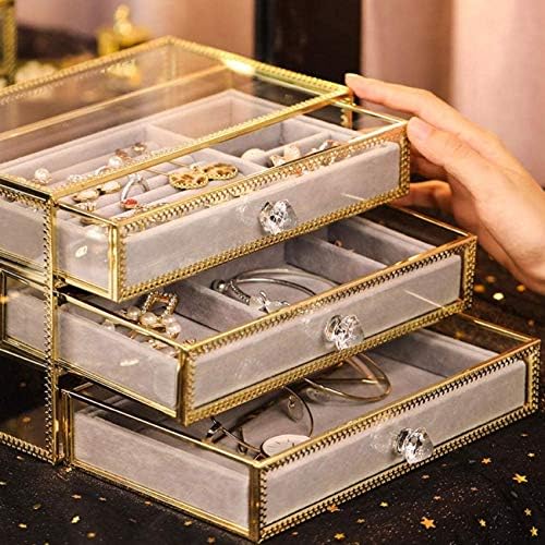 3 Tier Jewelry BoxFull glass construction with gold border for a luxurious design. The inner box is made of velvety to protect your precious accessories.The gold colored metal lace and clear glass are joined together to create a solid construction.Simple and elegant appearance, beautiful and luxury. It will make your jewelry look beautiful.Glass is more scratch resistant than acrylic and does not tarnish over time. Plenty of room for your favorite jewelry and items.