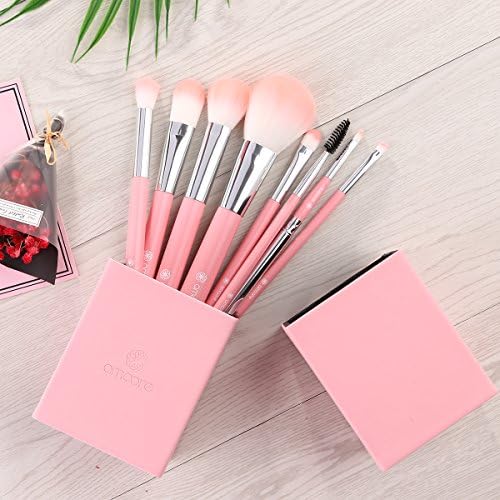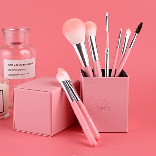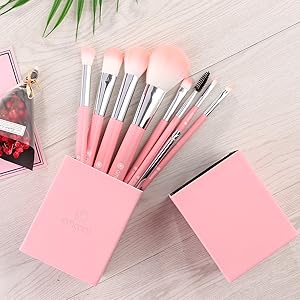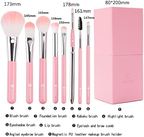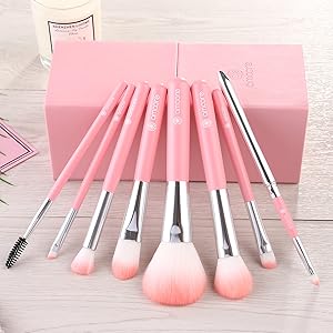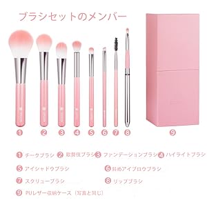 8本セット:ファンデーションブラシ、パウダーブラシ、チークブラシ、アイシャドウブラシ、スクリューブラシ、斜アイブロウブラシ、ハイライトブラシ、キャップ付リップブラシがある。日常メイクに必要なブラシが全て揃っている。