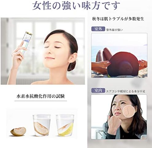 水素豊富水の浸透力:肌に水素水ミストをすることで世界一番小さい分子H2、水素水の細かい分子はお肌の奥までたっぷり浸透し、活性酸素を減らすことで、ハリ・透明感のある美肌へ導いてくれます。肌が疲れていると感じたときや、化粧崩れが気になる日中、乾燥が気になった時等、気になったらその場で水を入れて、水素水ミストを浴びることが出来る手軽な携帯水素水ミスト。