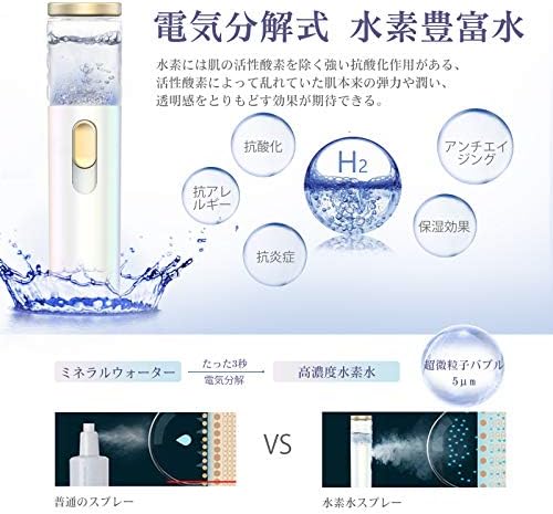 電気分解式水素水美顔器:たった3秒で吸水タンクに搭載した電極が水を電気分解して超微粒子バブル 5umの高濃度水素水を生成!水素には肌の活性酸素を除く強い抗酸化作用がある、活性酸素によって乱れていた肌本来の弾力や潤い、透明感を取り戻す効果が期待できます。極性のオート切り替え機能により電極の劣化を抑制し、長期間衛生的に利用できます。 水素豊富水の浸透力:肌に水素水ミストをすることで世界一番小さい分子H2、水素水の細かい分子はお肌の奥までたっぷり浸透し、活性酸素を減らすことで、ハリ・透明感のある美肌へ導いてくれます。肌が疲れていると感じたときや、化粧崩れが気になる日中、乾燥が気になった時等、気になったらその場で水を入れて、水素水ミストを浴びることが出来る手軽な携帯水素水ミスト。 乾燥や紫外線、ホルモンバランスの乱れ、ストレスなどにより肌が小さな炎症を起こしてしまいます。水素豊富水には、抗酸化作用だけではなく抗炎症作用もあり、肌荒れ=肌の炎症にも効果があります。 USB充電式&持ち運び便利:水素水を持ち歩く新習慣。洗顔やスキンケア、お化粧直しに。ブラッシング前の髪に。 お風呂上りやスポーツのあとに。 乾燥するデスクワークや日焼けが気になる移動中に。 いつでもどこでもたっぷりのミストでお肌に髪に水素補給。 いつもの自分に水素をプラスする新習慣でキレイを叶える。