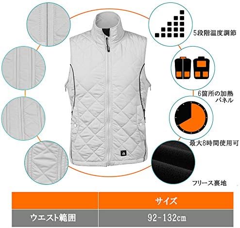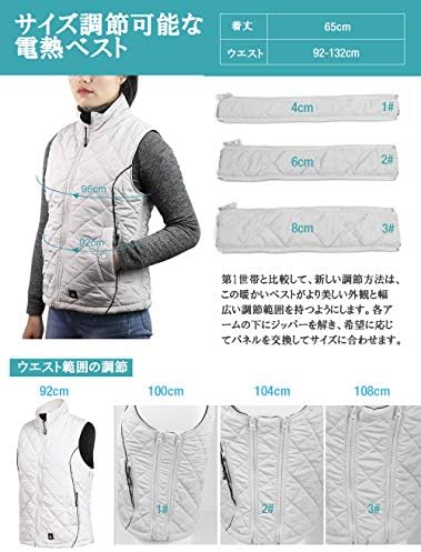 S~XXLサイズ調整可能。40℃から80℃までの温度範囲で5段階調整可能。ボタンを押すと簡単に調温できます。最大使用時間は10時間です。バストは92cmから128㎝まで自由に調整可能です。サイズのお困りがない!