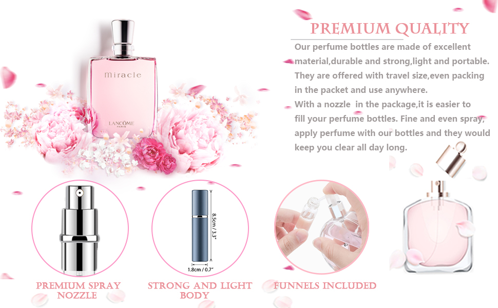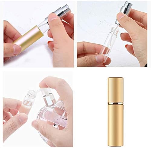 Package Contents: Perfume atomizer x 3 (gold x 1, red x 1, blue x 1), accessory x 1. Refill Method: Step 1: Spray head and atomizer of the perfume bottle – remove the outer shell. Step 2: Insert the spray head pipe into the hole on the bottom of the atomizer body. Step 3: Push the atomizer body up and down vertically to complete refilling! Approved for airplane carry-on