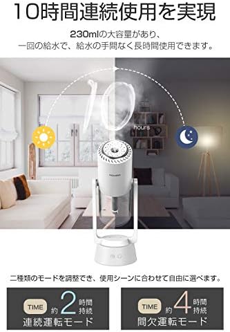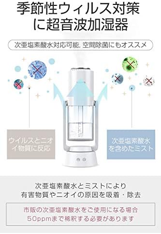 [Hypochlorite Water Compatible] Add thin hypochlorite water to the humidifier tank to sanitize the whole room. Use hypochlorous water with a concentration of about 50 ppm. When people are in use, use hypochlorous acid water to prevent spraying, so it is recommended to “spatial disinfection” during times without people. Please fill hypochlorite water with 1 plus 10 times more tap water