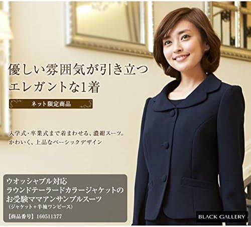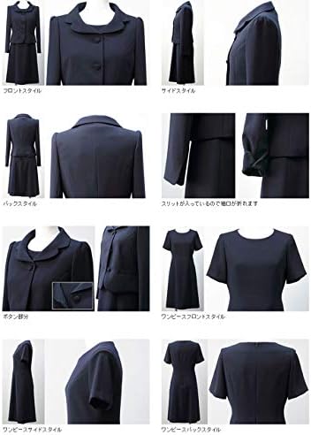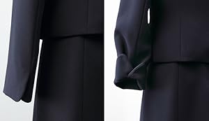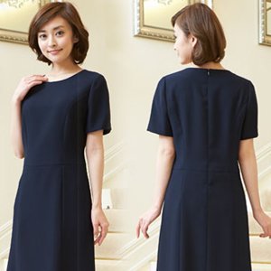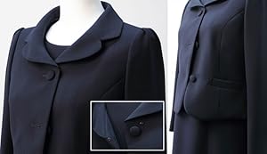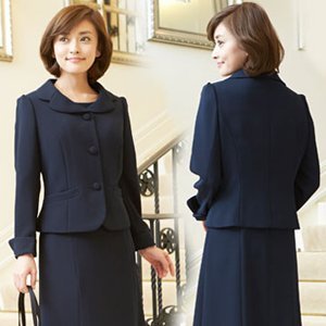 丸みを帯びた小さめのテーラードカラーに、くるみ3ツボタンが清楚な印象のジャケットと、非常にシンプルなデザインのワンピースのセットスーツです。