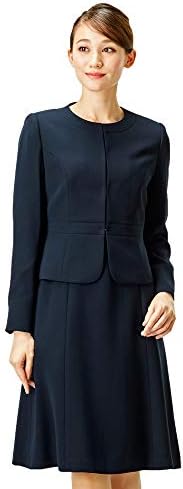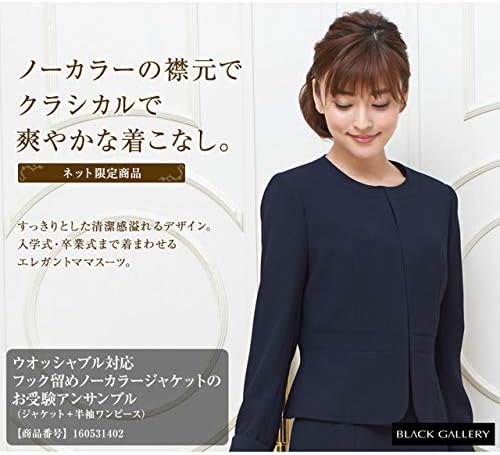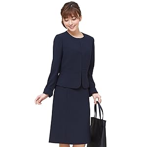 ノーカラーのジャケットと、ウエスト切り替えのワンピースのセットスーツです。