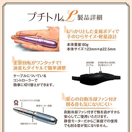 Rotation speed: 6,000 – 2,500 RPM (actual tested color): Pink/Silver/Black; Product weight: 2.8 oz (80 g); Product size: 4.8 inches (123 mm) x φ0.9 inches (22.5 mm); Accessories: Main unit: AC adapter: 100 V – 240 V (50 – 60 Hz); 60 Hz); 6 Hz); Instruction manual (English language not guaranteed).